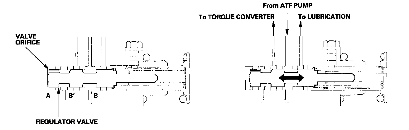 The regulator valve maintains constant hydraulic pressure from the ATF pump to the hydraulic control system, while also furnishing fluid to the lubricating system and torque converter. Fluid from the ATF pump flows through B and B'. Fluid entering from B flows through the valve orifice to the A cavity. This pressure of the A cavity pushes the regulator valve to the right side, and this movement of the regulator valve uncovers the fluid port to the torque converter and the relief valve. The fluid flows out to the torque converter and the relief valve, and the regulator valve moves to the left side. According to the level of the hydraulic pressure through B, the position of the regulator valve changes, and the amount of fluid from B' through torque converter changes. This operation is continued, maintaining the line pressure.