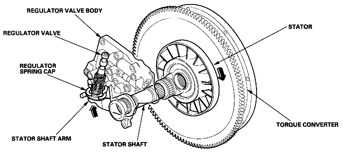 Increases in hydraulic pressure according to torque are performed by the regulator valve using stator torque reaction. The stator shaft is splined to the stator in the torque converter, and its arm end contacts the regulator spring cap. When the vehicle is accelerating or climbing (Torque Converter Range), stator torque reaction acts on the stator shaft, and the stator arm pushes the regulator spring cap in the direction of the arrow in proportion to the reaction. The stator reaction spring compresses, and the regulator valve moves to increase the line pressure which is regulated by the regulator valve. The line pressure reaches its maximum when the stator torque reaction reaches its maximum.