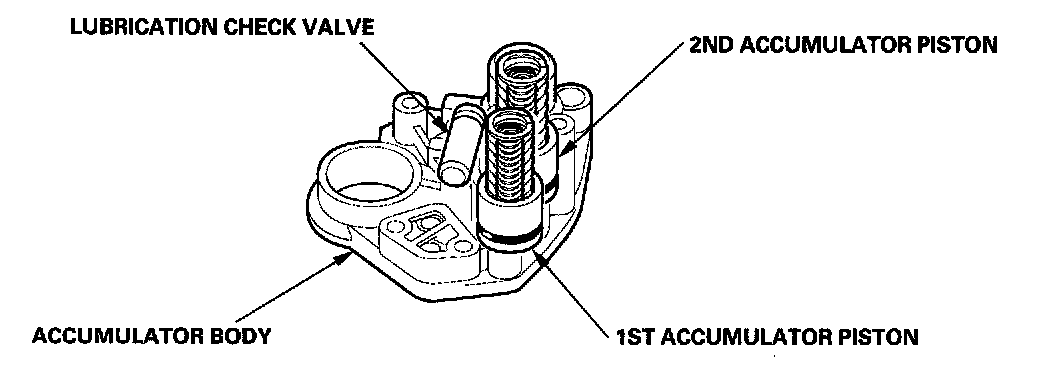 The accumulator body is on the torque converter housing, next to the main valve body. It contains the 1St and 2nd accumulators and the lubrication check valve.