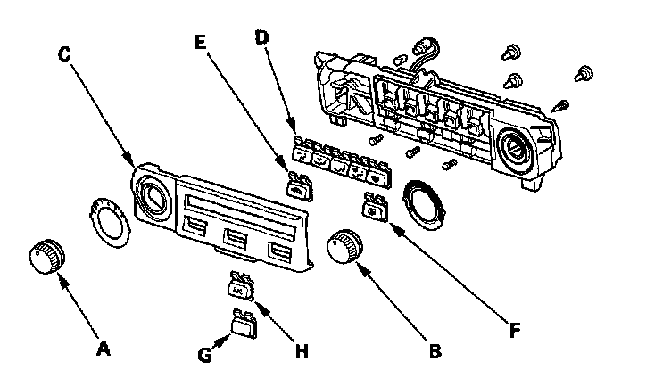 1. Remove the fan switch (A) and temperature control (B) dials, then remove the front panel (C). Remove the mode control switch (D), recirculation control switch (E), rear defogger switch (F) and A/C switch lid (G) (or A/C switch (H)) buttons.