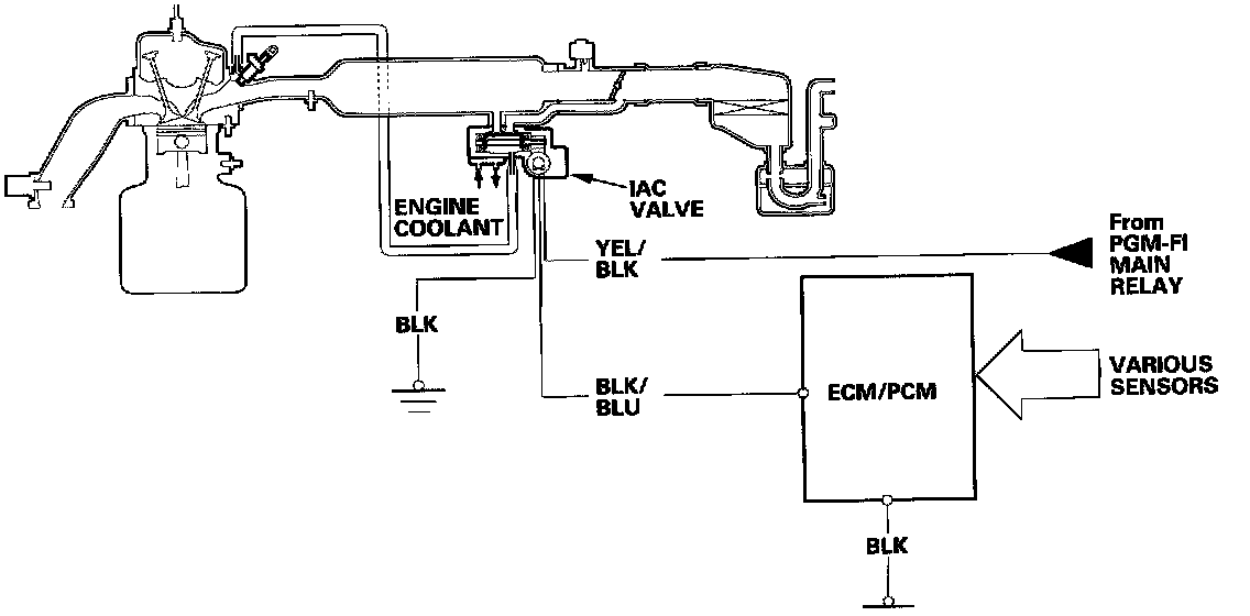 When the engine is cold, the A/C compressor is on, the transmission is in gear, the brake pedal is depressed, the P/S load is high, or the alternator is charging, the ECM/PCM controls current to the IAC valve to maintain the correct idle speed.The idle speed of the engine is controlled by the IAC (Idle Air Control) valve: