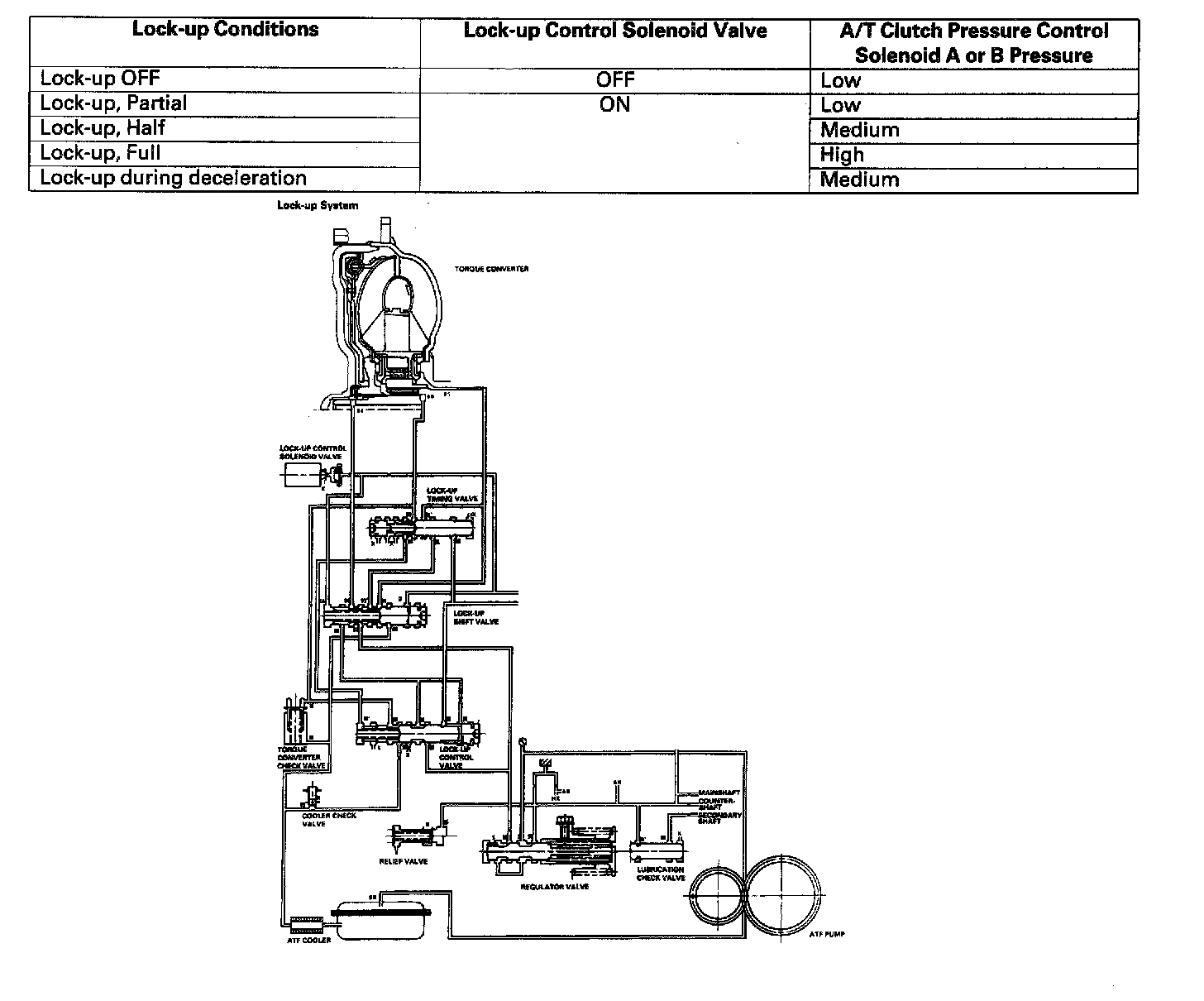 The table above shows the lock-up conditions for lock-up control solenoid valve and A/T clutch pressure control solenoid A or B pressure.
