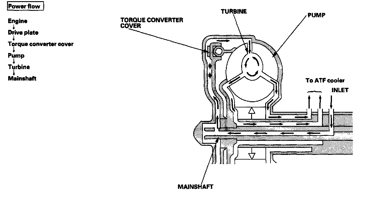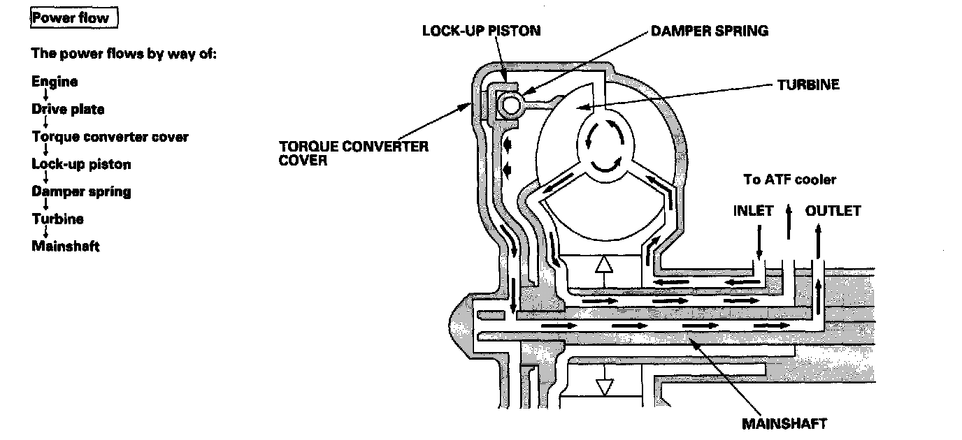 With the lock-up clutch on, fluid in the chamber between the torque converter cover and the lock-up piston is drained off, and the converter fluid exerts pressure through the piston against the torque converter cover. As a result, the converter turbine is locked to the converter cover. The effect is to bypass the converter, placing the vehicle in direct drive.
