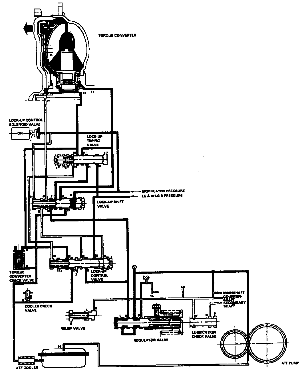 When the vehicle speed further increases, the PCM controls A/T clutch pressure control solenoid valves A and B to increase LS A or LS B pressure (58). The LS A or LS B pressure (58) is applied to the lock-up control valve and the lockup timing valve, and moves them to the left side. Under this condition, torque converter back pressure (F2) is fully released, causing the lock-up clutch to be fully engaged.