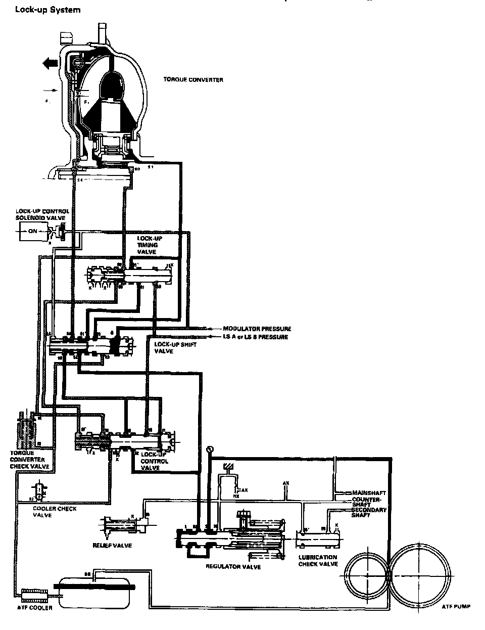When decelerating, the PCM controls the lock-up control solenoid valve and the A/T clutch pressure control solenoid valve A or B to activate the same as in half lock-up conditions. Medium LS A or LS B pressure (58) is applied to the lock-up control valve to release torque converter back pressure (F2). Torque converter back pressure (F2) goes lower, and this allows a greater amount of pressure (F1) to work on the lock-up clutch to engage the lock-up clutch. Back pressure (F2), which still exists, prevents the clutch from fully engaging.