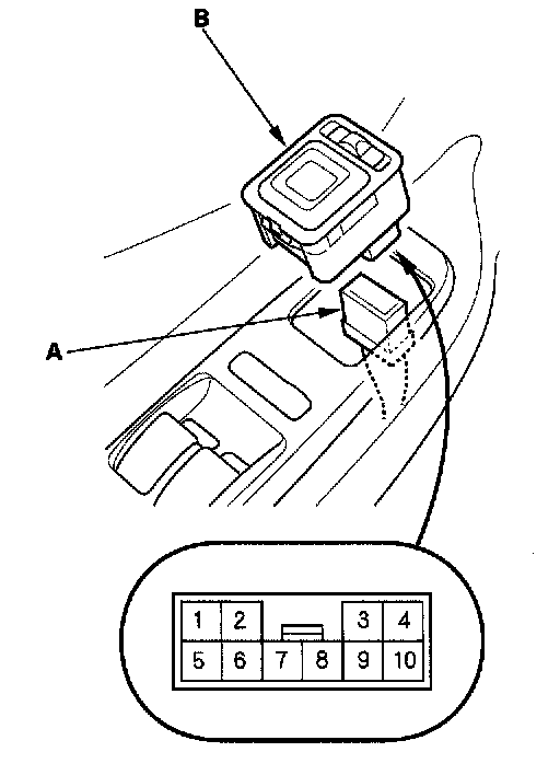 1. Remove the driver's door panel.2. Disconnect the 10P connector (A) from the power mirror switch (B).