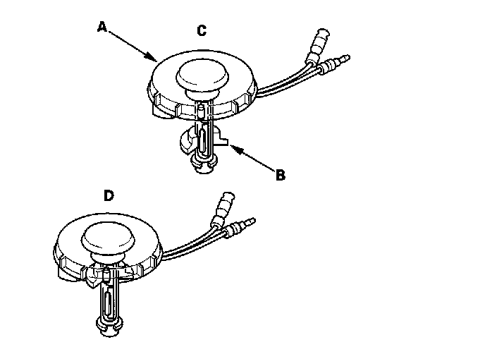 2. Check for continuity between the terminals with the float in the down position (C) and the up position (D):