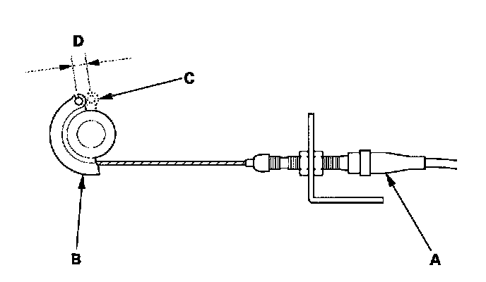 3. Measure the amount of movement of the output linkage (B) until the engine speed starts to increase. At first, the output linkage should be located at the fully closed position (C). The free play (D) should be 3.75 ± 0.5 mm (0.15 ± 0.02 in.).