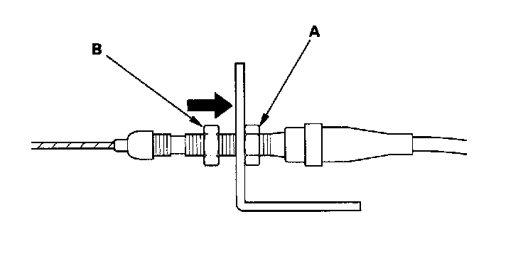 6. Pull the cable so that the adjusting nut (A) touches the bracket, and tighten the locknut (B).