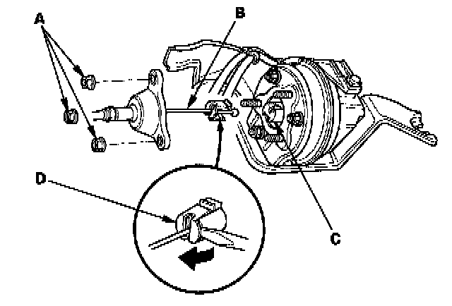 5. Disconnect the actuator cable (B) from the actuator rod (C) by releasing the clip (D) from the rod with a screwdriver.