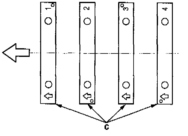 5. Install the bearings (A) and bearing caps (B) with the arrow (C) facing the timing belt end of the engine.