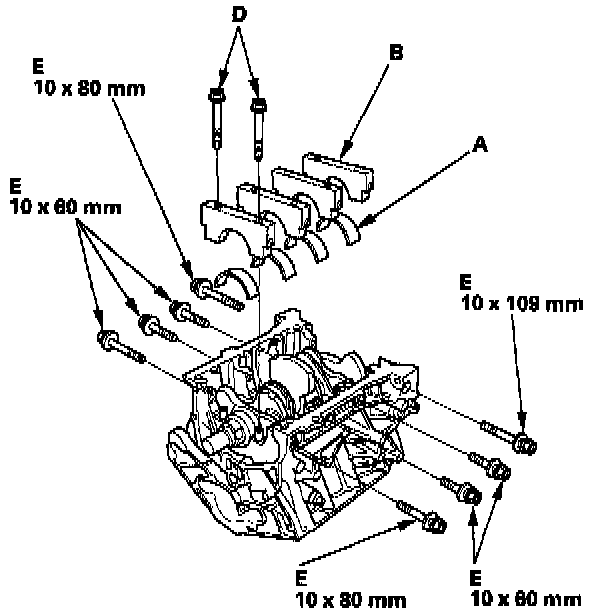 6. Apply engine oil to the bolt threads and flange, then install the bearing cap bolts (D) and bearing cap side bolts (E).