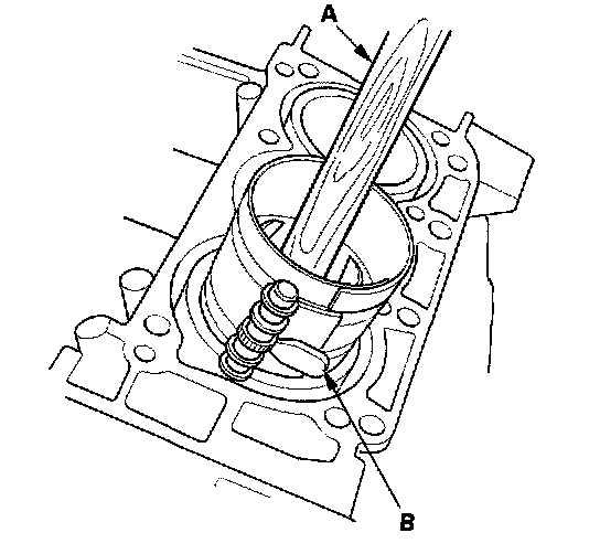 11. Position the piston in the cylinder, and tap it in using the wooden handle of a hammer (A). Maintain downward force on the ring compressor (B) to prevent the rings from expanding before entering the cylinder bore.