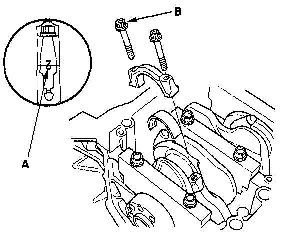 18. Torque the bearing cap bolts (A), then torque the bearing cap side bolts (B). Follow the numbered sequence shown.