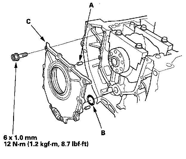 23. Apply liquid gasket, part No. 08718-0001 or 08718-0003, evenly to the block mating surface of the left side cover and to the inner threads of the bolt holes. Install the dowel pins (A), new O-ring (B) and the engine block end cover (C) on the cylinder block.