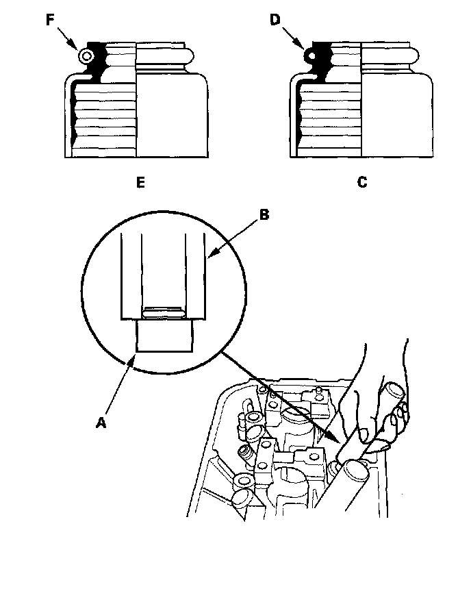 NOTE: Exhaust valve seals (C) have a black spring (A) and intake valve seals (E) have a white spring (F); they are not interchangeable.