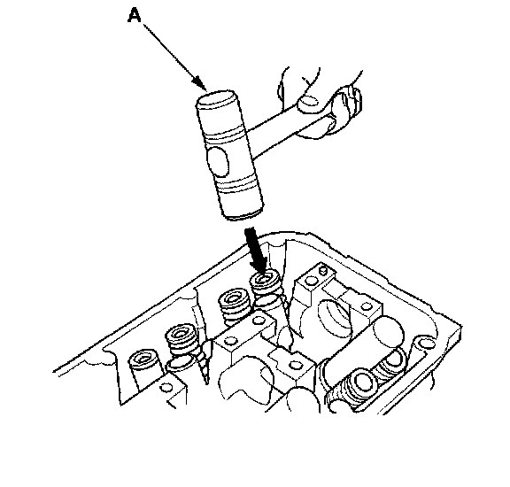 7. Lightly tap the end of each valve stem two or three times with a plastic mallet (A) to ensure proper seating of the valve and valve keepers. Tap the valve stem only along its axis so you do not bend the stem.