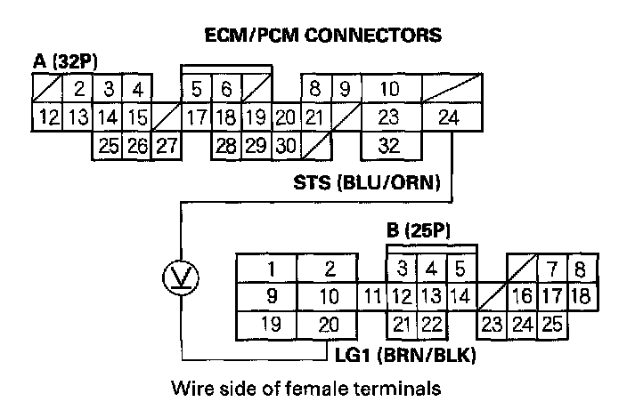 1. Measure voltage between ECM/PCM connector terminals A24 and B20 with the ignition switch in the start position (III).