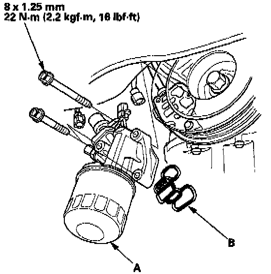 3. If the resistance is within specifications, remove the VTEC solenoid valve/oil filter assembly (A) from the oil pump, and check the VTEC solenoid valve filter (B) for clogging. If there is clogging, clean the filter and replace the engine oil filter and the engine oil.