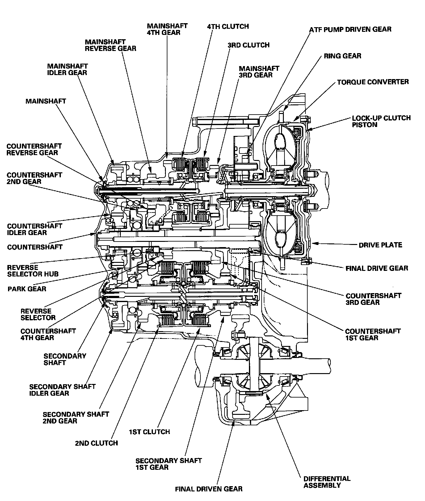 The four-speed automatic transmission uses hydraulically-actuated clutches to engage or disengage the transmission gears. When hydraulic pressure is introduced into the clutch drum, the clutch piston moves. This presses the friction discs and steel plates together, locking them so they don't slip. Power is then transmitted through the engaged clutch pack to its hub-mounted gear. Likewise, when the hydraulic pressure is bled from the clutch pack, the piston releases the friction discs and the steel plates, and they are free to slide past each other. This allows the gear to spin independently on its shaft, transmitting no power.