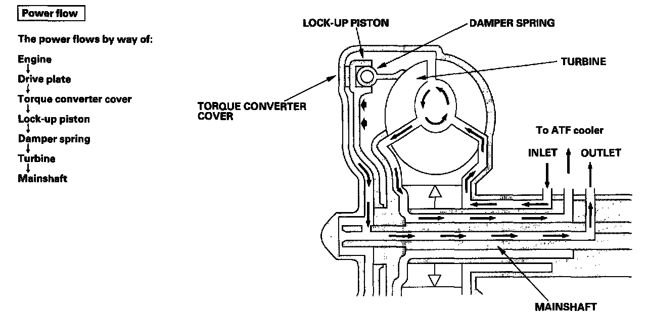 With the lock-up clutch on, fluid in the chamber between the torque converter cover and the lock-up piston is drained off, and the converter fluid exerts pressure through the piston against the torque converter cover. As a result, the converter turbine is locked to the converter cover. The effect is to bypass the converter, placing the vehicle in direct drive.