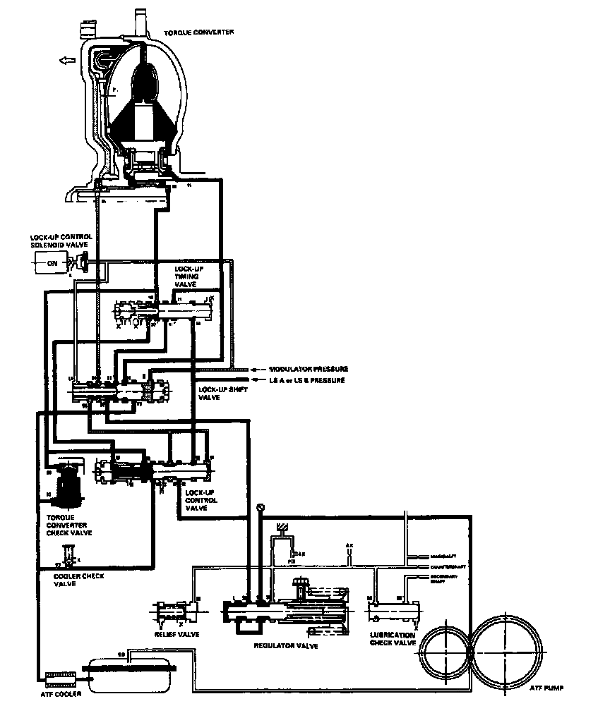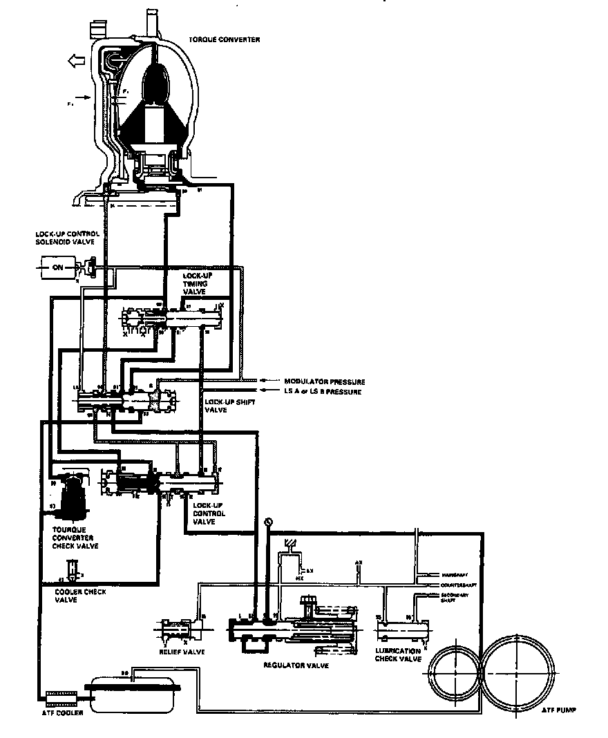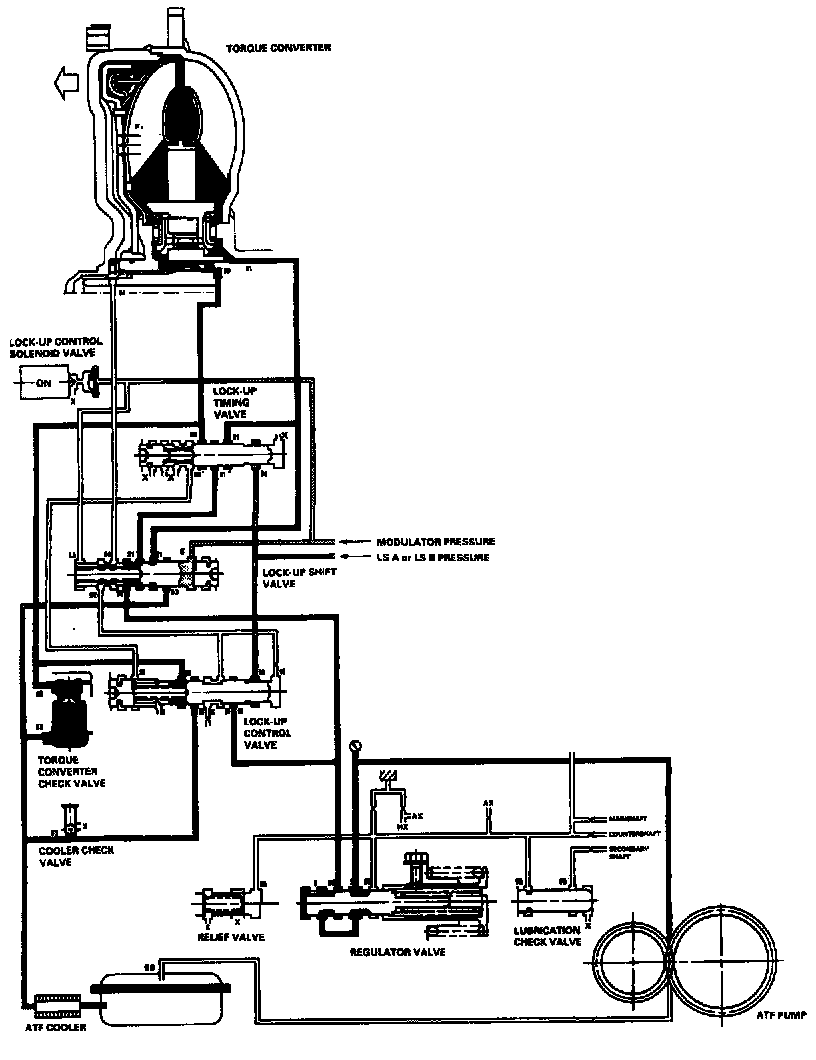 When the vehicle speed further increases, the PCM controls A/T clutch pressure control solenoid valves A and B to increase LS A or LS B pressure (58). The LS A or LS B pressure (58) is applied to the lock-up control valve and the lockup timing valve, and moves them to the left side. Under this condition, torque converter back pressure (F2) is released fully, causing the lock-up clutch to be fully engaged.