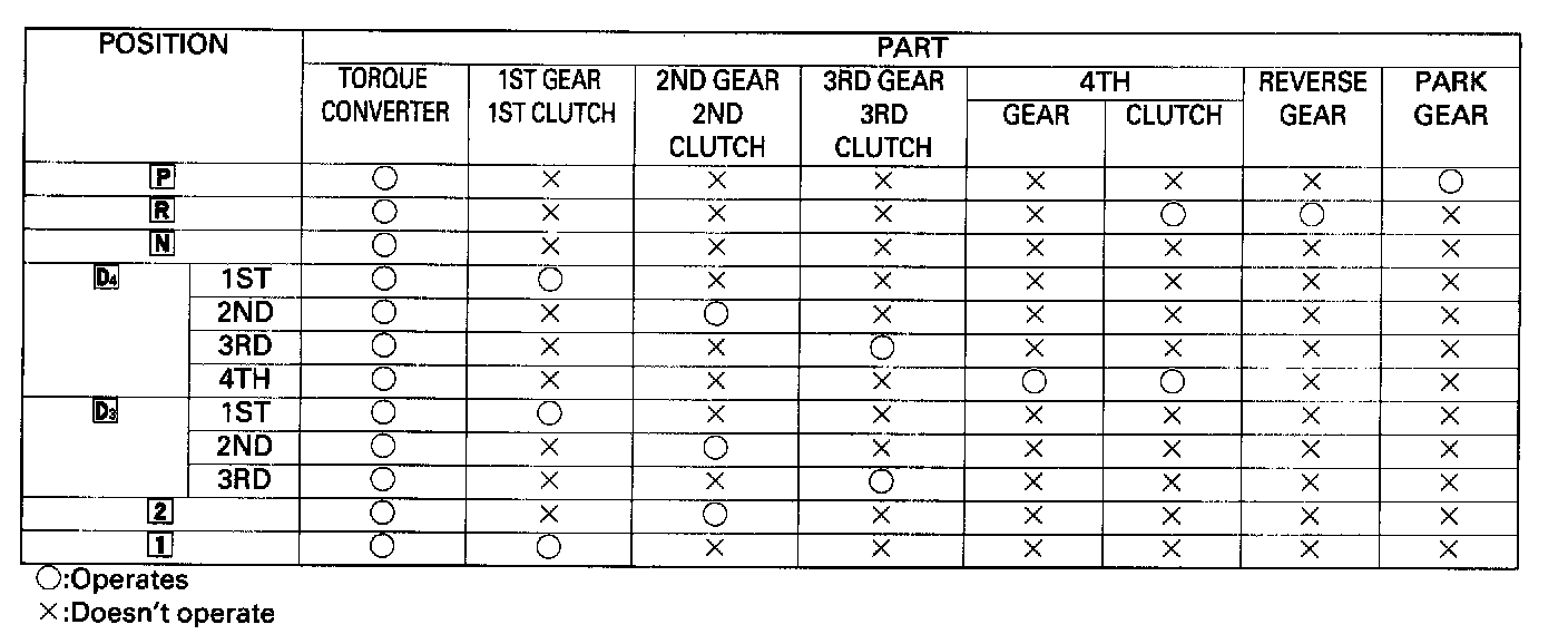 In [D4] or [D3] position, the optimum gear is automatically selected from the 1st, 2nd, 3rd and 4th gears, according to conditions such as the balance between the throttle opening (engine loading) and vehicle speed.