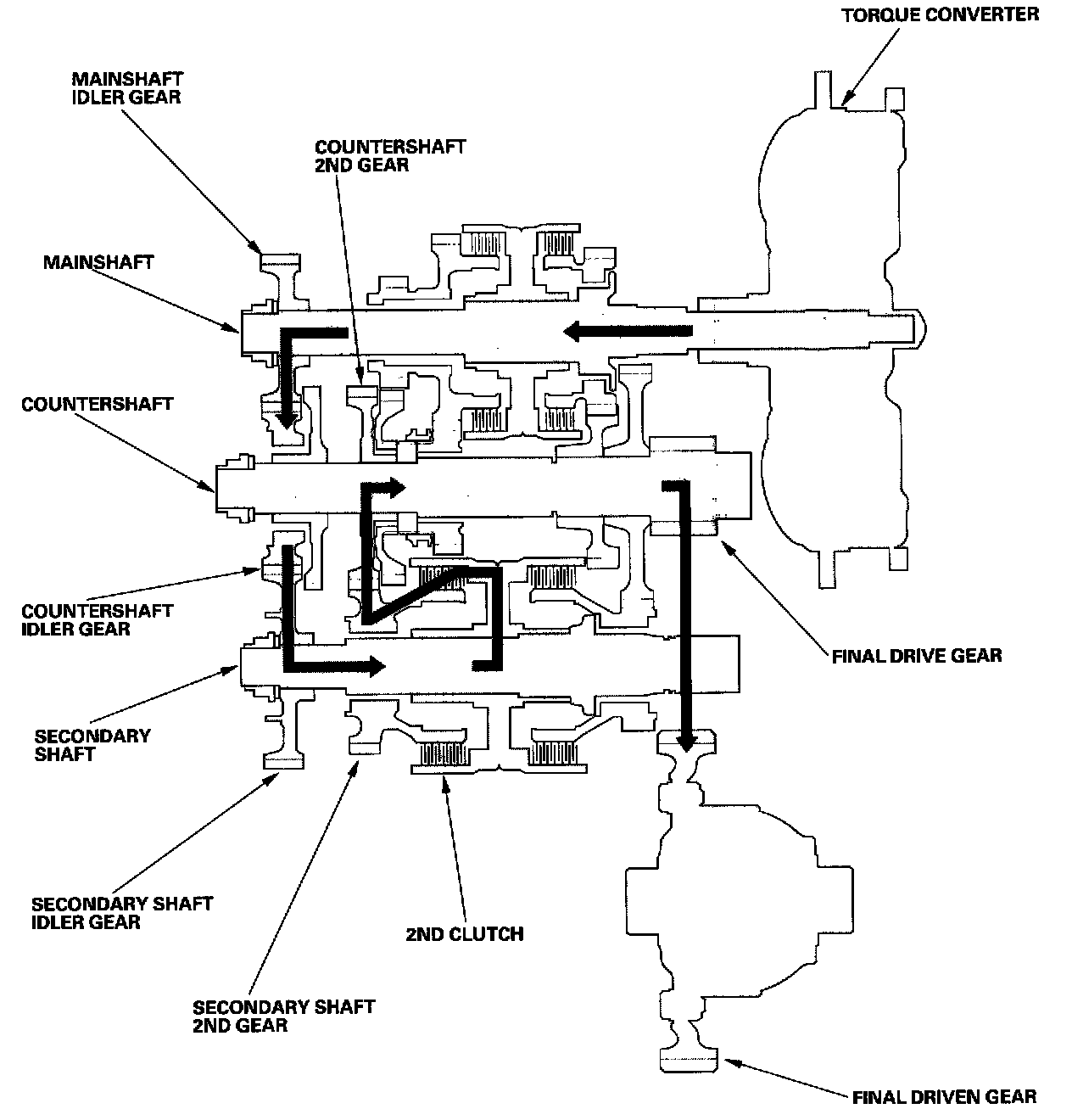 - The secondary shaft 2nd gear drives the countershaft 2nd gear and the countershaft. Power is transmitted to the final drive gear, which in turn drives the final driven gear.