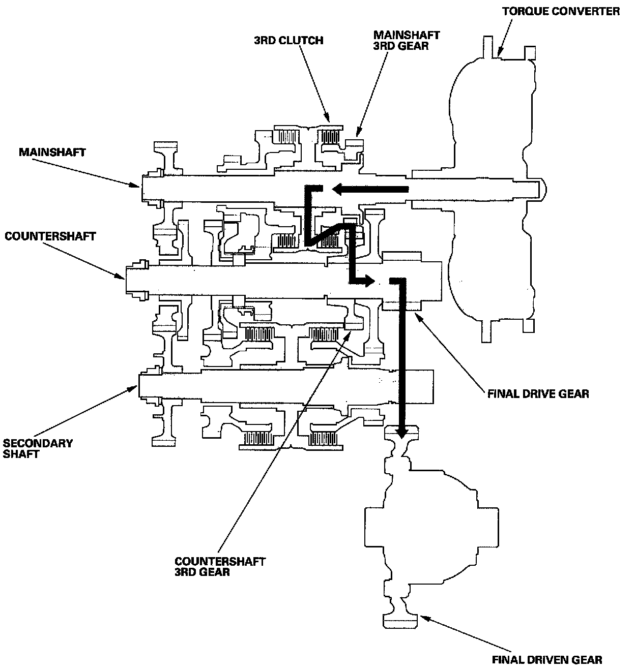 - Hydraulic pressure is applied to the 3rd clutch, then the 3rd clutch engages the mainshaft 3rd gear with the mainshaft.