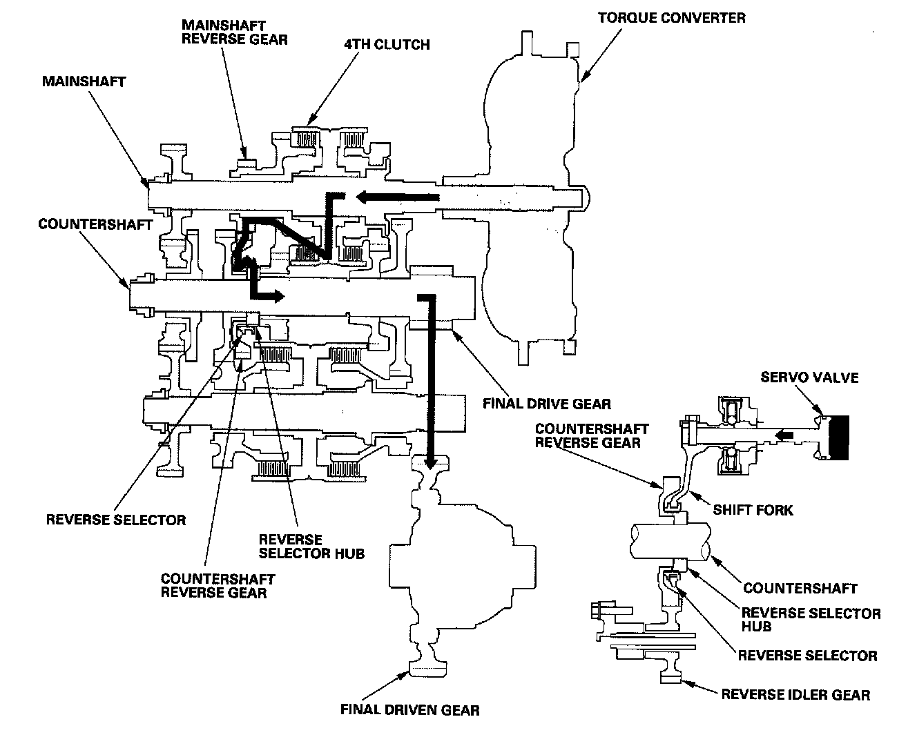 - Hydraulic pressure is applied to the servo valve to engage the reverse selector with the countershaft 4th gear while the shift lever is in the forward range ([D4], [D3], [2] and [1] position).