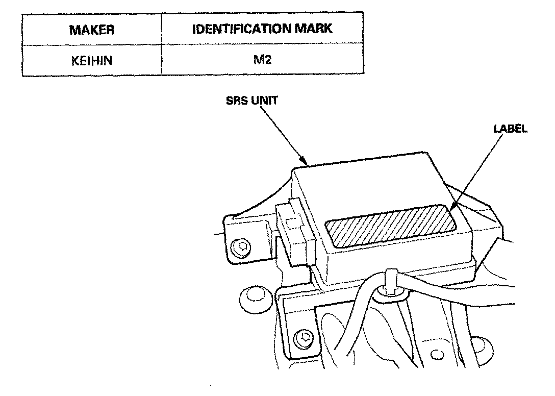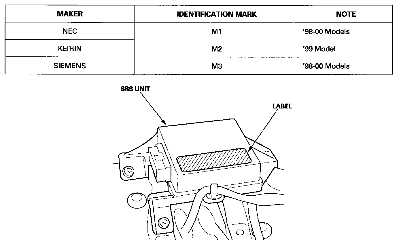 The troubleshooting procedures are different for each type of SRS unit. Identify the SRS unit in the vehicle using the chart below, then follow the proper flow chart in the following pages. The identification mark is at the end of the model number on the SRS unit.