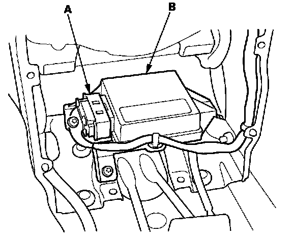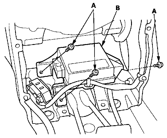 5. Remove the three Torx bolts (A) from the SRS unit (B), then pull out the SRS unit from the bracket.