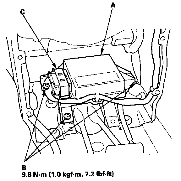 1. Install the new SRS unit (A) with Torx bolts (B), then connect the SRS main harness 18P connector (C) to the SRS unit; push it into position until it clicks.