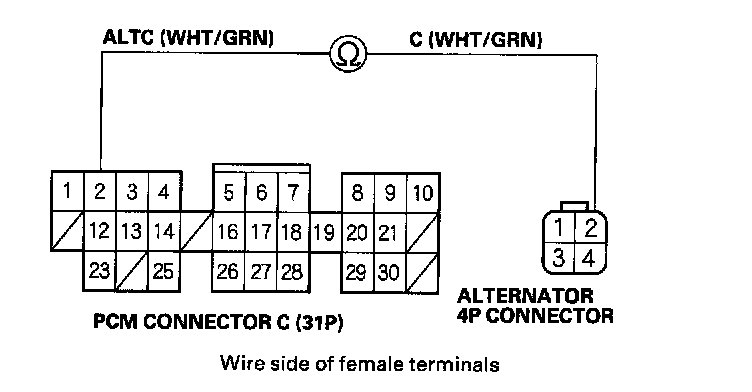 10. Check for continuity between the PCM 31P connector terminal No.2 and alternator 4P connector terminal No.2.