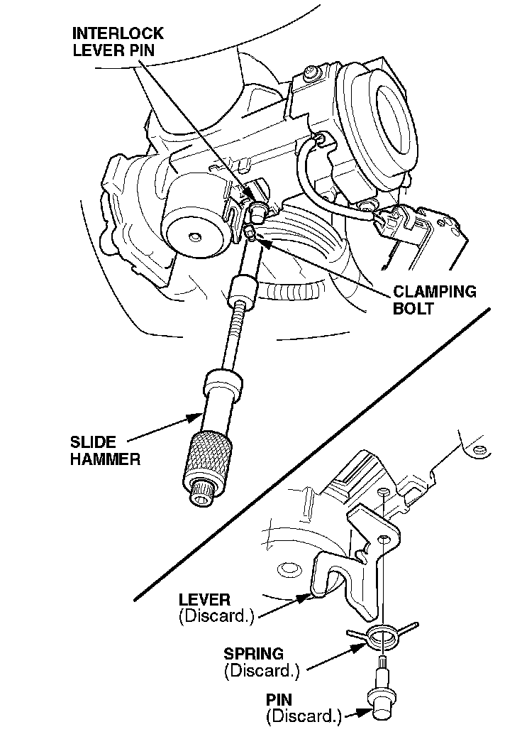 5. Attach the slide hammer to the interlock lever pin, and use it to remove the pin. Discard the pin, the lever, and the spring.