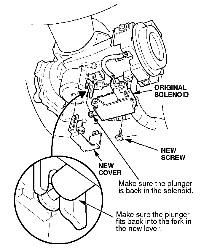 15. Remove the solenoid cover, and make sure the groove of the solenoid plunger is installed in the fork on the lever.