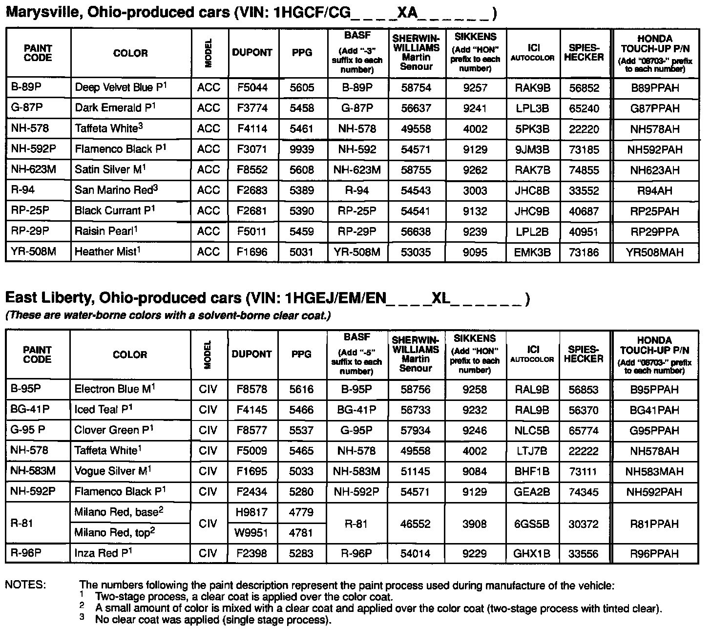 Paint formulations are determined by each paint company.For questions about formulas or matching, contact your local paint company's nearest regional office. American Honda does not endorse any paint company or type of paint; this information is provided for reference only.