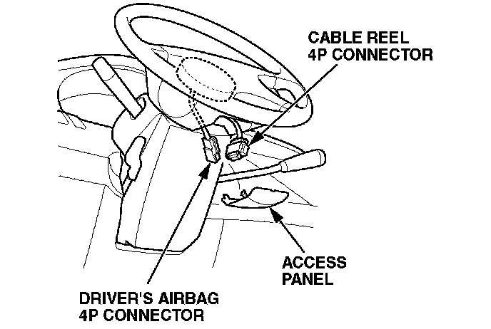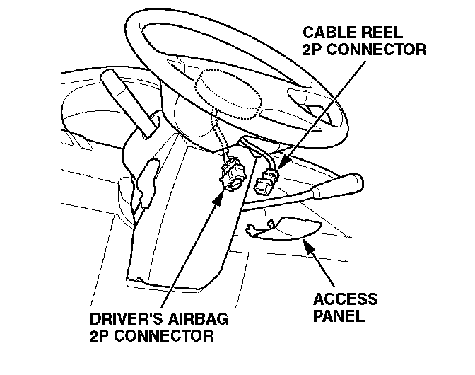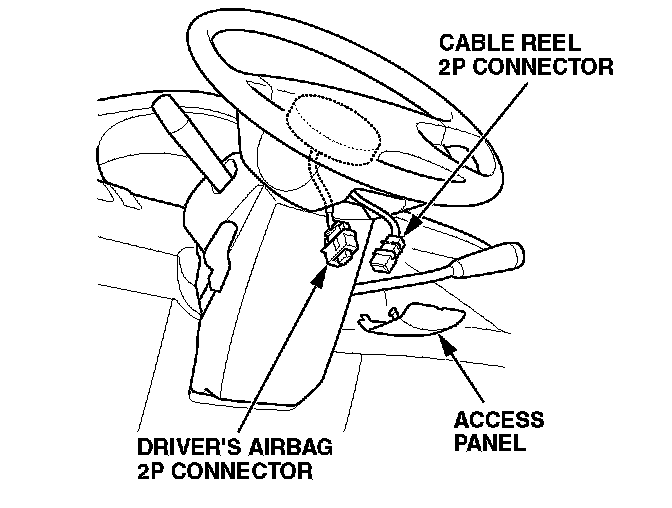 23. 1998-00 models: Reconnect the 2P cable reel connector to the driver's airbag 2P connector. 2001-02 models: Reconnect the 4P cable reel connector to the driver's airbag 4P connector.