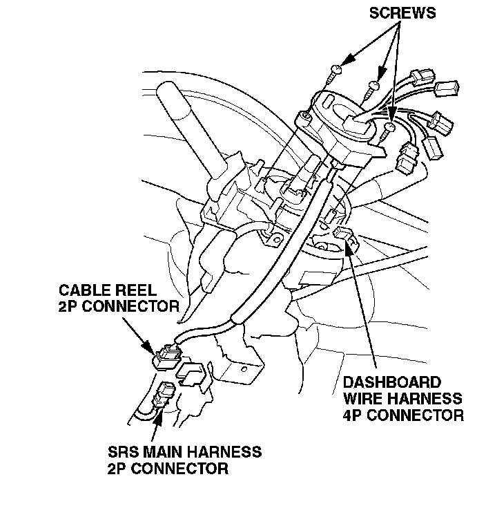 2P connector from the cable reel 2P connector, and then detach the dashboard wire harness 4P connector from the cable reel. Remove the screws from the cable reel, and then remove the cable reel from the column.