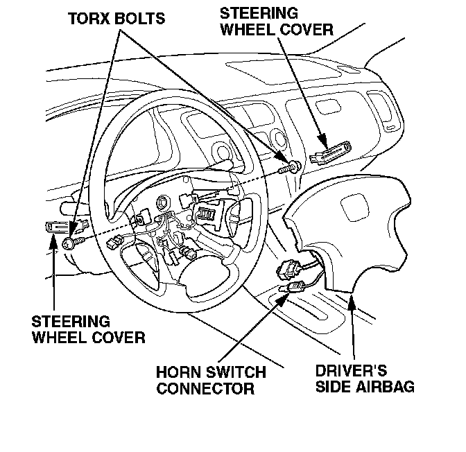 5. 1999-01 models: Remove the two steering wheel covers. Use a Torx T30 bit to remove the two Torx bolts. Lift up the driver's airbag, disconnect the horn switch 1P connector, and remove the driver's airbag.