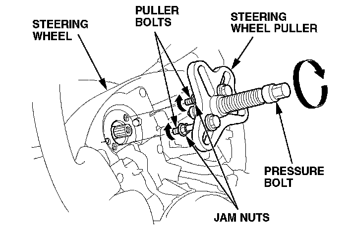 9. Using a commercially available steering wheel puller, release the steering wheel from the steering shaft. While pulling on the steering wheel, note these items: