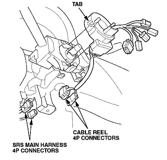 2001-02 models: Unplug the SRS main harness 4P connectors from the cable reel 4P connectors. Release the tab, and then remove the cable reel from the column