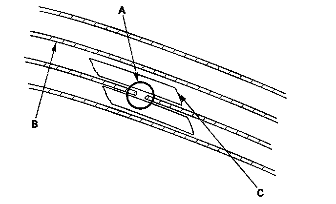 2. Carefully mask above and below the broken portion of the defogger wire (B) with cellophane tape (C).