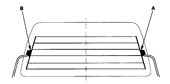 NOTE: Be careful not to scratch or damage the defogger wires with the tester probe.1. Check for voltage between the positive terminal (A) and body ground with the ignition switch and defogger switch ON.
