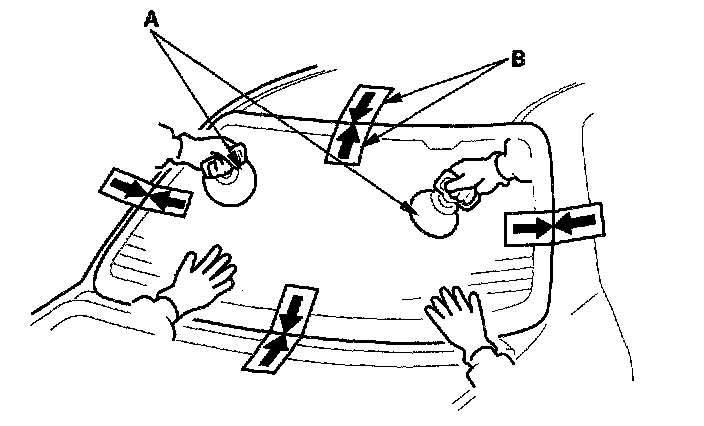 26. Use suction cups (A) to hold the rear window over the opening, align it with the alignment marks (B) you made in step 19, and set it down on the adhesive. Lightly push on the rear window until its edges are fully seated on the adhesive all the way around. Do not open or close the doors until the adhesive is dry.