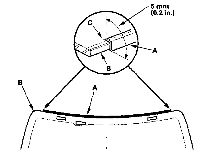 18. Install the upper fasteners (A), and glue the lower fasteners (B) to the body as shown. Align the lower fasteners with 1.0 mm (0.04 in.) offset surface of the rear parcel shelf (C).
