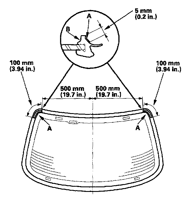 25. Pack adhesive into the cartridge without air pockets to ensure continuous delivery. Put the cartridge in a caulking gun, and run a bead of adhesive (A) around the edge of the rear window (B) as shown. Apply the adhesive within 30 minutes after applying the glass primer. Make a slightly thicker bead at each corner.