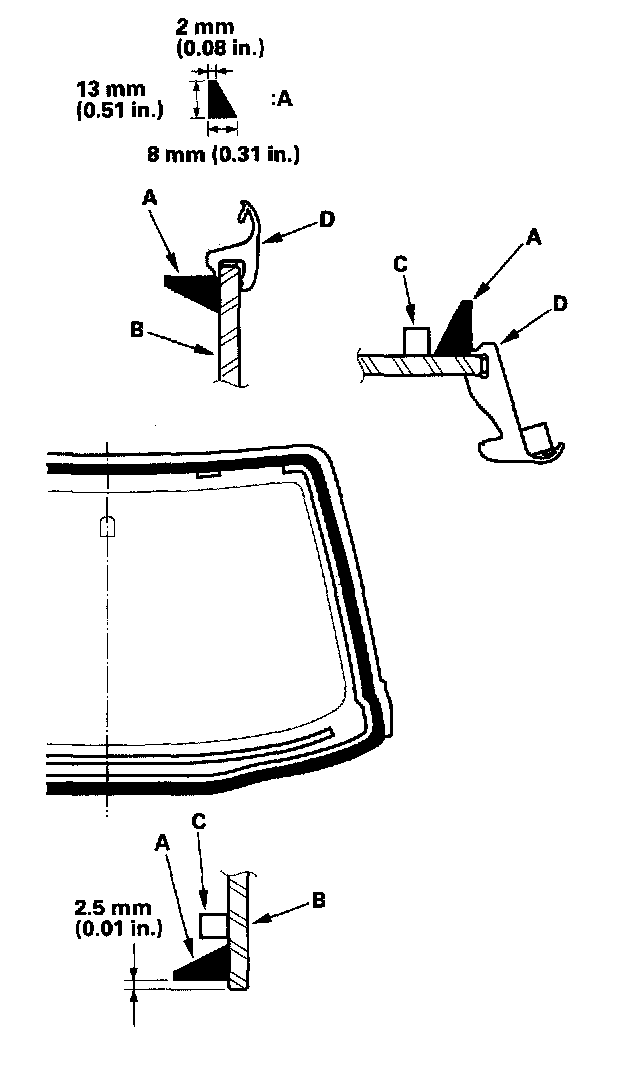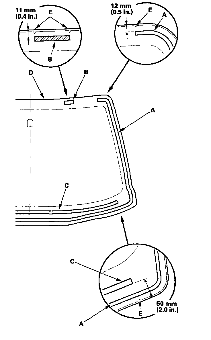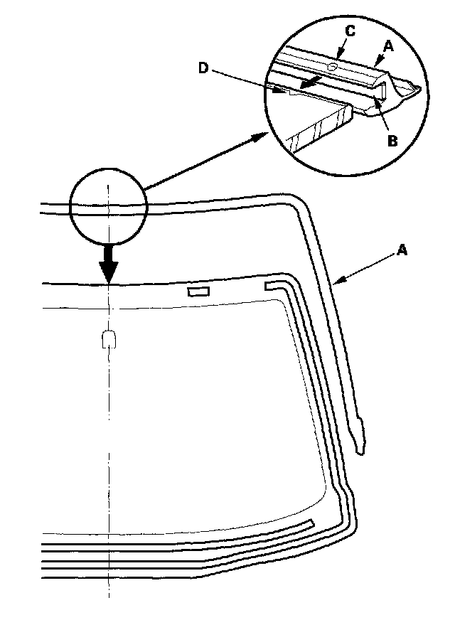 21. Pack adhesive into the cartridge without air pockets to ensure continuous delivery. Put the cartridge in a caulking gun, and run a bead of adhesive (A) around the edge of the windshield (B) between the dam (C) and molding (D) as shown. Apply the adhesive within 30 minutes after applying the glass primer. Make a slightly thicker bead at each corner.