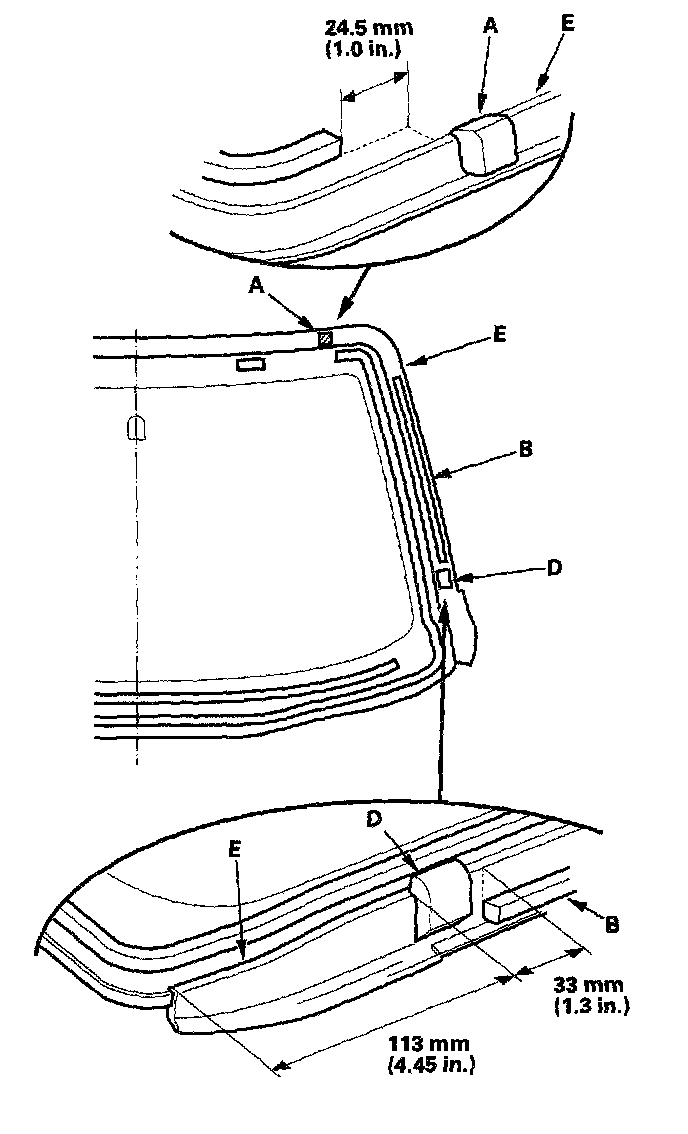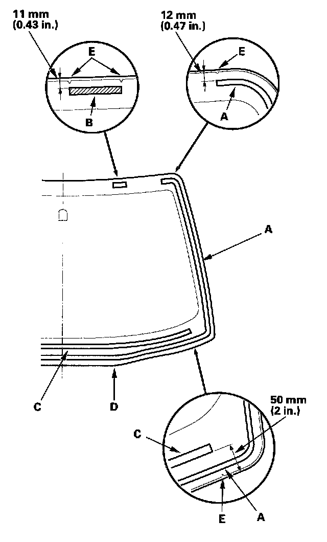 13. Glue the molding upper seal (A) butyl tape (coupe) (B) or molding Corner Seal (Sedan) (C) and molding side seal (D) to the molding (E). Be careful not to touch the windshield where adhesive will be applied.