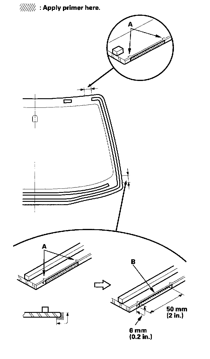 - Never touch the primed surfaces with your hands. If you do, the adhesive may not bond to the windshield properly, causing a leak after the windshield is installed.